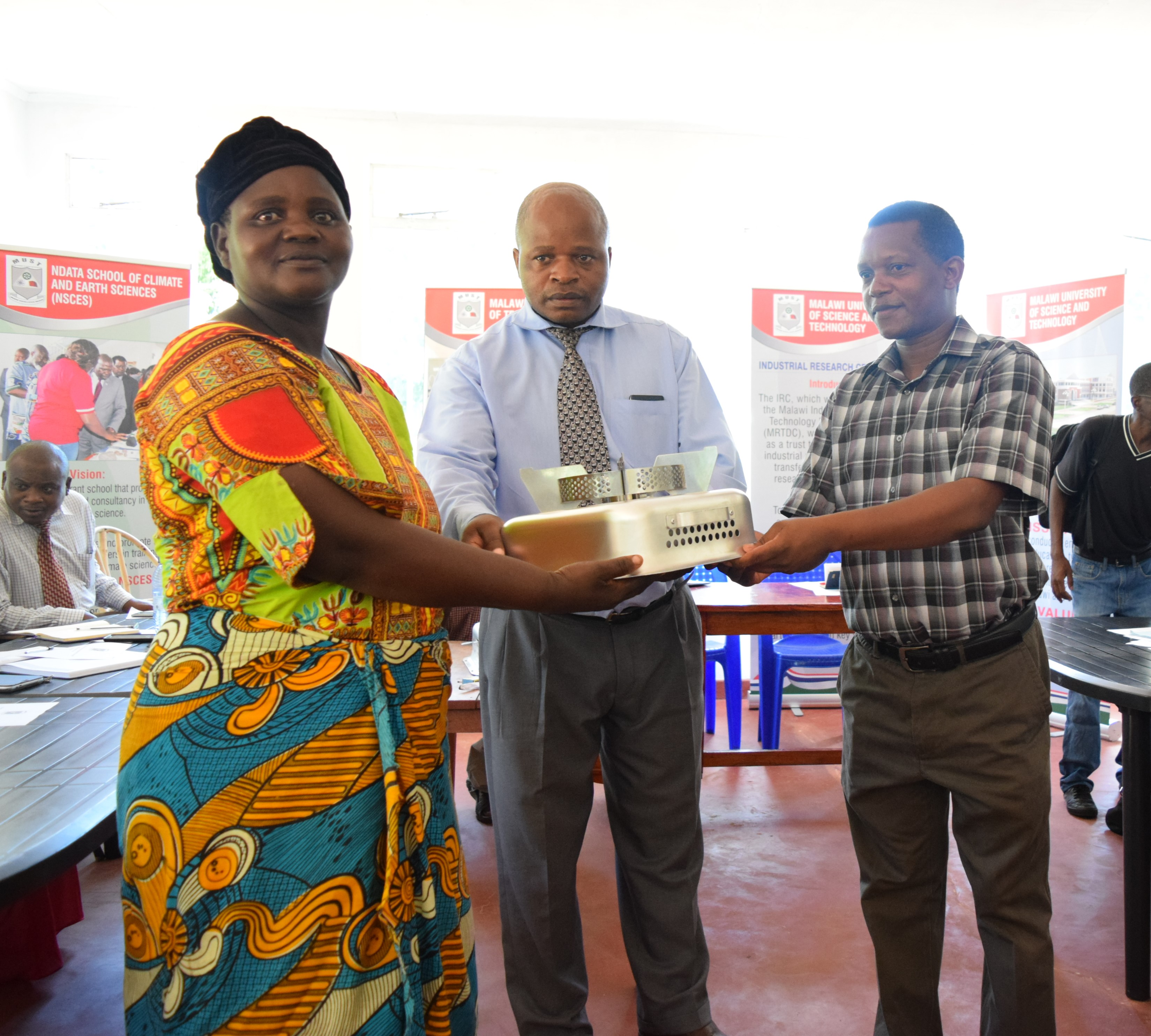 A beneficiary receives ethanol stove from Mr. Mhango (C)and Dr Mweta (R) during the handover ceremony.