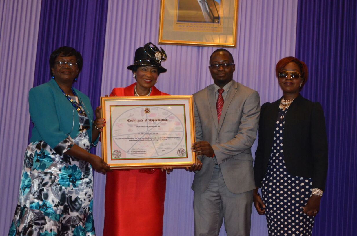 Dr. Beatrice Mtimuni today received an honorary award from Her Excellency Madam Dr. Getrude Mutharika for her significant contribution to Human Nutrition in Malawi. Dr. Mtimuni has dedicated more than 40 years of her life to the improvement of Human Nutrition in Malawi through Teaching, Research and Outreach.