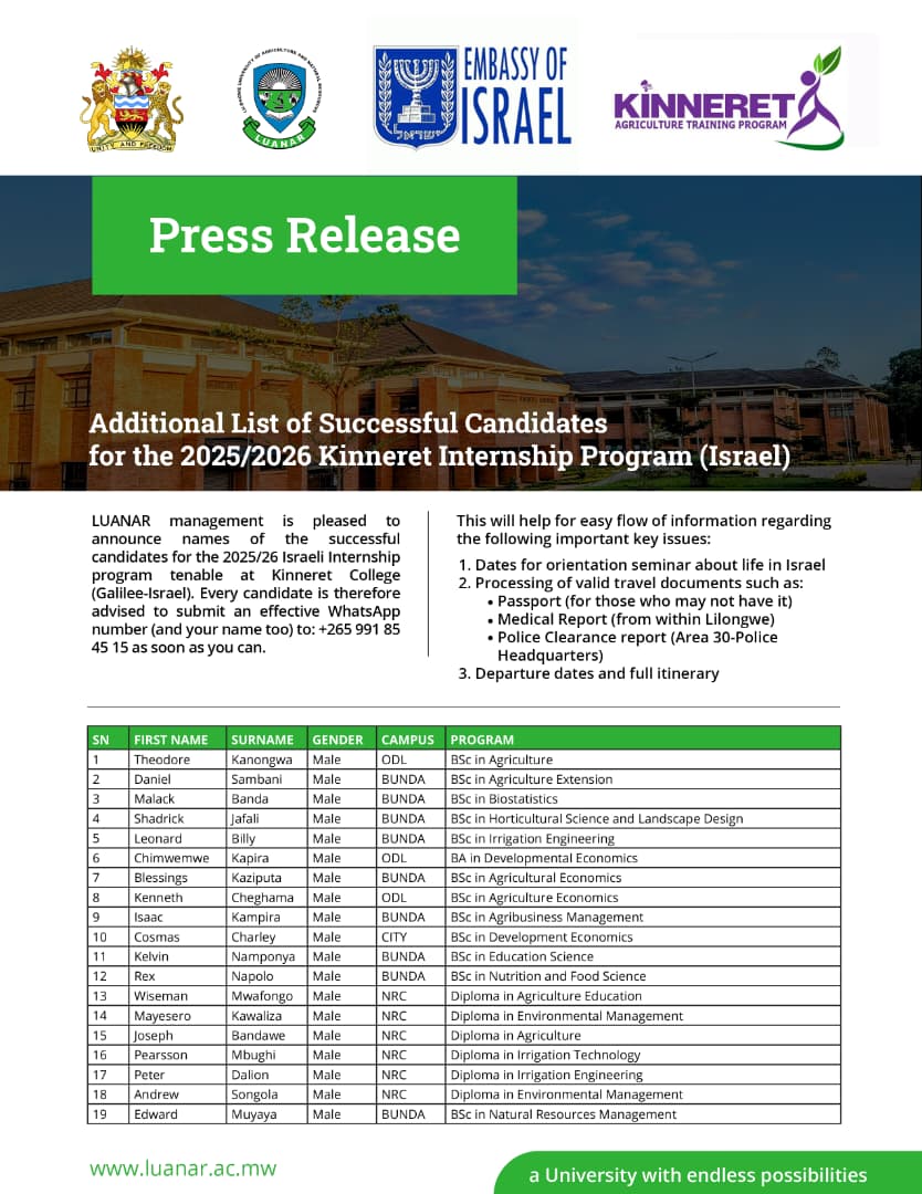 LUANAR management is pleased to announce names of the successful candidates for the 2025/26 Israeli Internship program tenable at Kinneret College (Galilee–Israel). Every candidate is therefore advised to submit an effective WhatsApp number (and your name too) to: +265 991 85 45 15 as soon as you can.